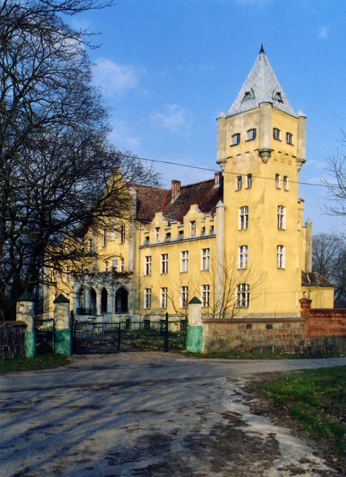 Das heutige „Schloss“ wurde 1866 im Tudorstil errichtet. Die ursprüngliche Gestalt des Putzbaus - ca. 41 × 16 Meter, zweigeschossig, hohes eingewölbtes Souterrain, dessen Sockel aus gequaderten Granitsteinen gebaut - wurde dominiert von dem oktogonalen, ehemals fünfgeschossigen Turmmassiv an der Südecke, dass über Zinnenbekrönung und Ecktürmchen verfügte, genauso wie der viergeschossige Rechteckturm an der nordöstlichen Schmalseite. Auf der Gegenseite, der südwestlichen Schmalseite, befindet sich eine aufgeständerte Veranda. An der nach Südost ausgerichteten Hofseite sowie an der nordwestlichen Seeseite befanden sich jeweils dreiachsige, mit Zinnenattika, Zinnenbekrönung und schlanken Ecktürmchen verzierte Mittelrisalite, von denen nur der Hofseitige übrig ist und nunmehr lediglich über einen flachen Dreiecksgiebel verfügt. Während die übrigen Gebäudeecken mit weiteren schlanken Türmen geziert waren, befand sich an der Hoffront ein nordostseitiger, einachsiger, zweieinhalbgeschossiger Eckrisalit, der wiederum mit zwei Ecktürmchen und Zinnenattika verziert war. Ein Pendant dessen, nur noch obendrein mit U-förmigen Fensterverdachungen versehen, befand sich auf der südwestlichen Schmalseite.[8]